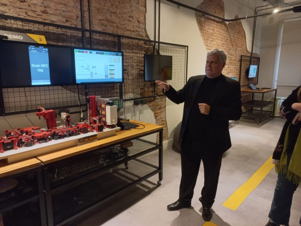 En primer lugar, los participantes tuvieron la oportunidad de interactuar con unas pantallas en las que se simulaba un sistema de gestión logística de una empresa. En el segundo paso, se pudo observar una maqueta que imitaba el funcionamiento de una línea de producción en la que se habían incorporado distintas máquinas para agilizar el trabajo. Asimismo, los presentes tuvieron acceso a una estación de realidad aumentada planteada con el objetivo de capacitar a los trabajadores de la fábrica en las tareas a desarrollar minimizando los peligros que estas pueden conllevar. También visitaron un sector en el que, mediante el uso de inteligencia artificial, se podía hacer un conteo de materiales de forma rápida y sencilla.